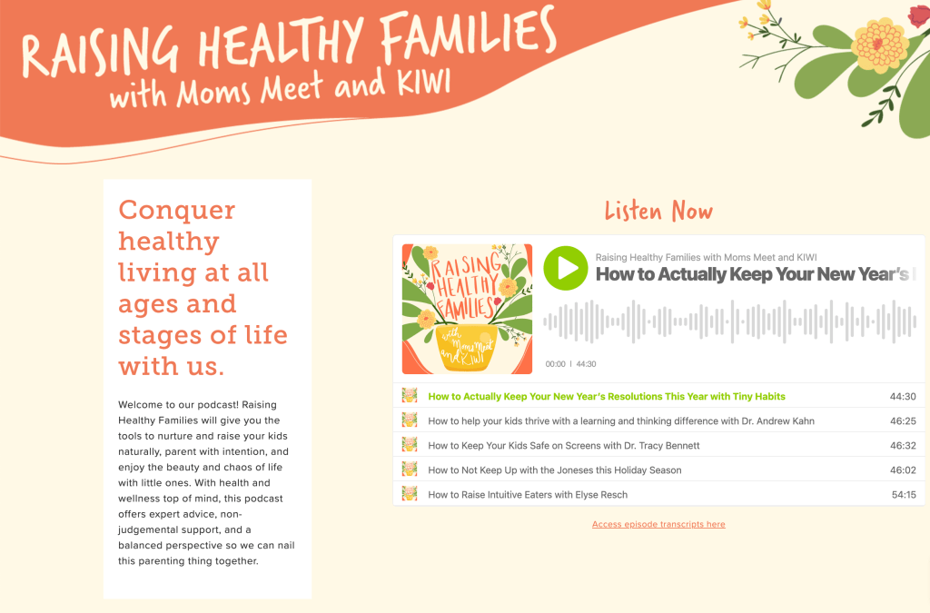 Raising Healthy Families branding included podcast name, description, marketing, and social media advertising. Maureen hosts and produces the fast-growing parenting podcast, now in its seventh season.